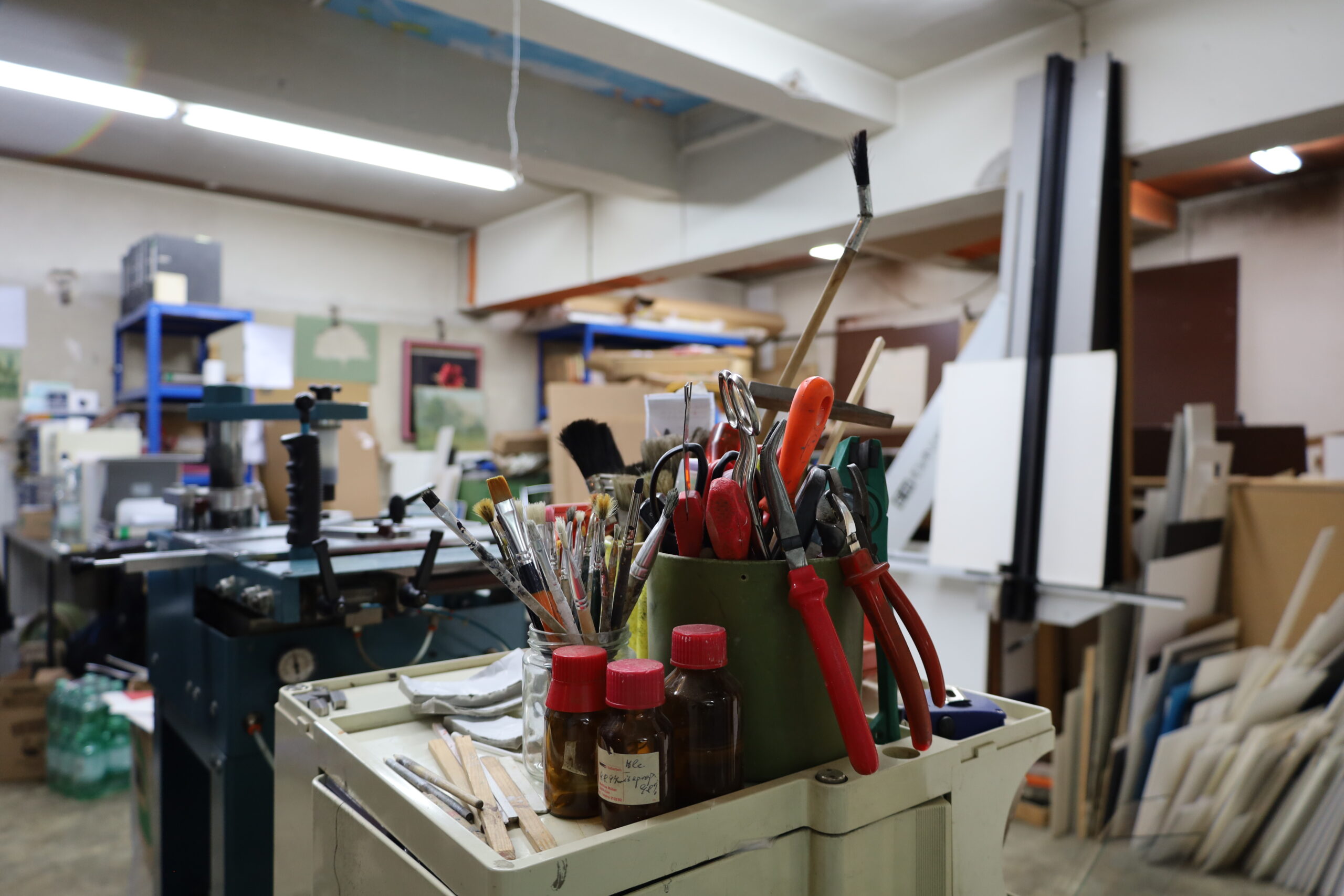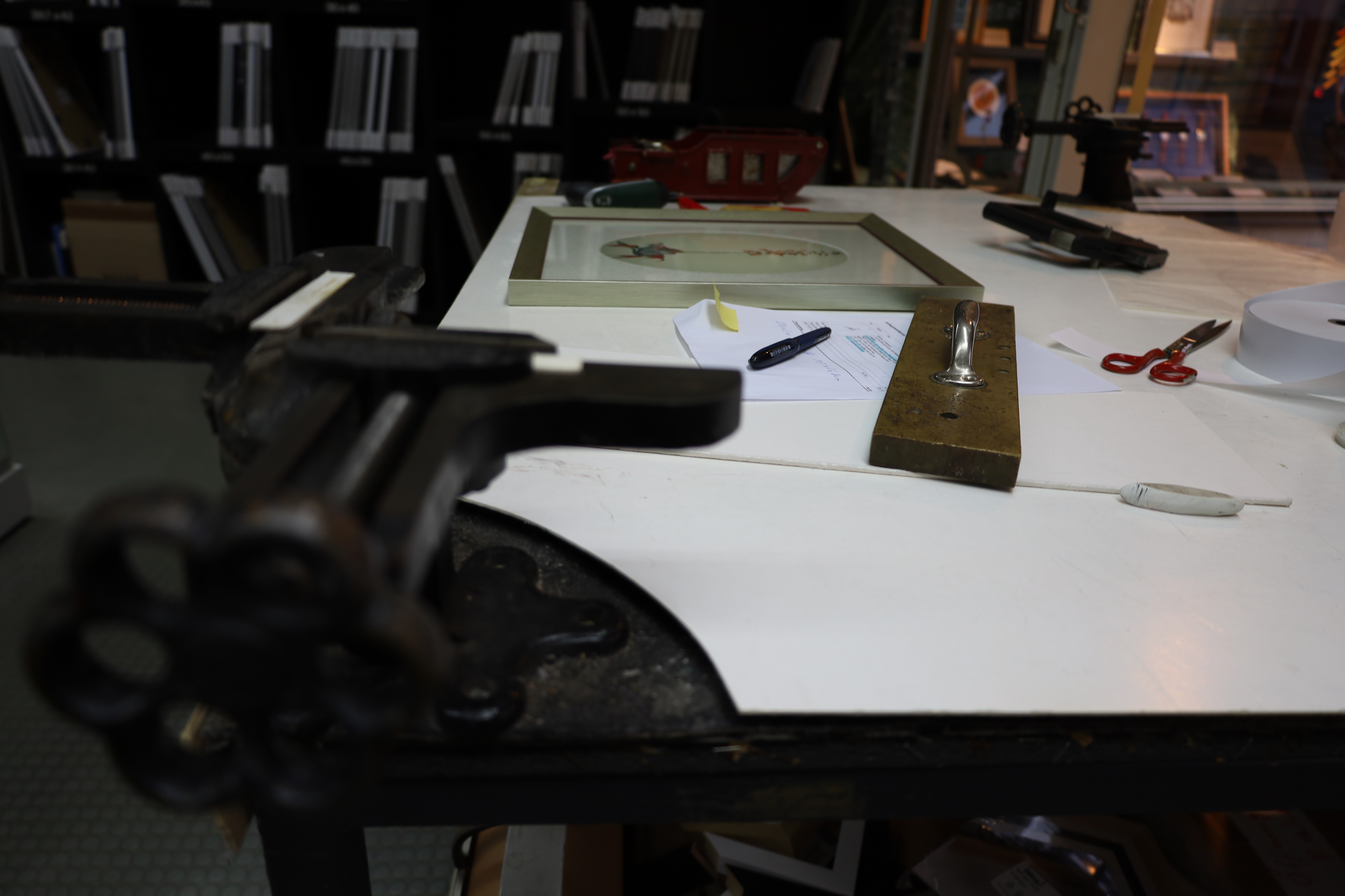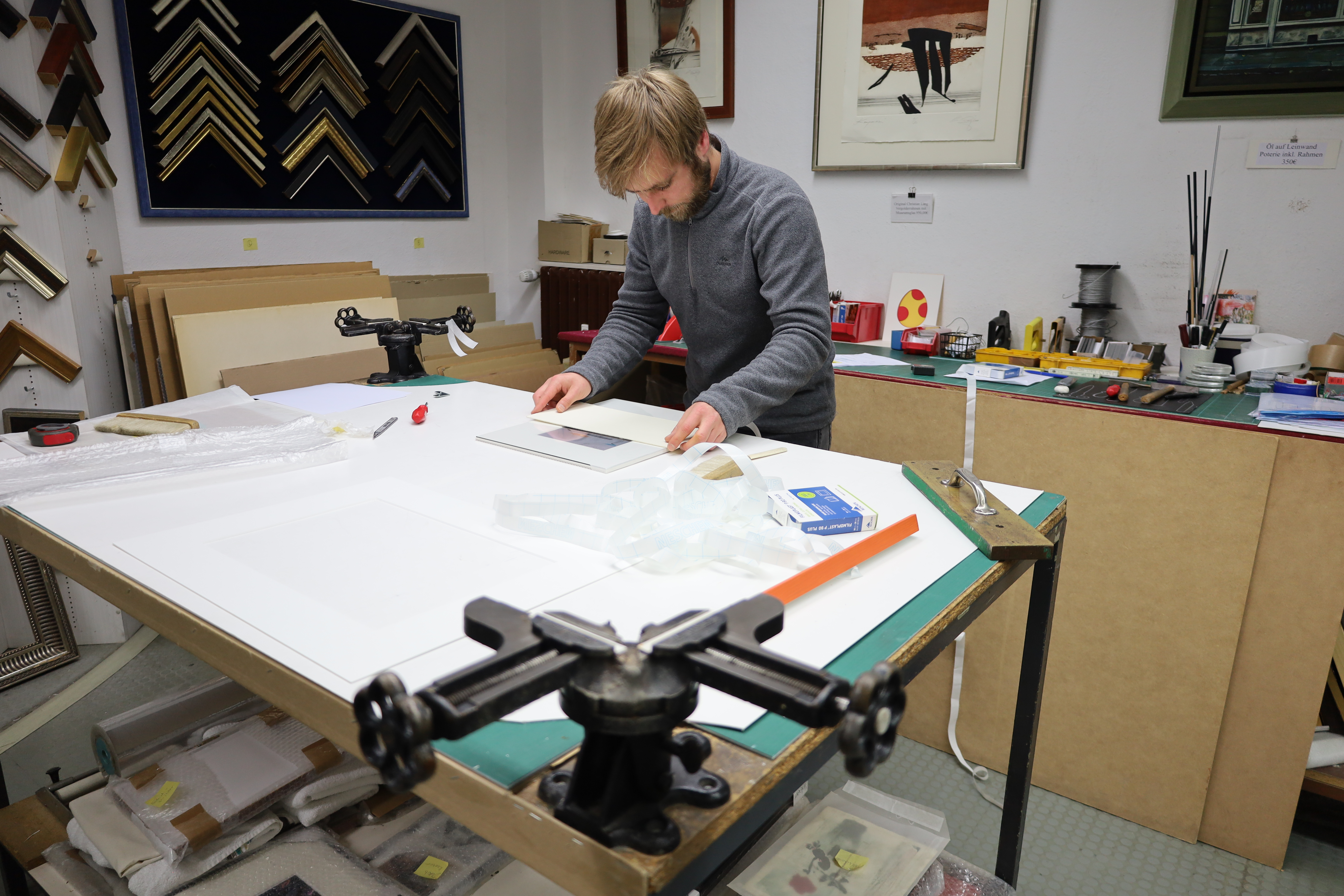 In der Werkstatt unseres Geschäftes werden die Leisten mit Glas und Passepartout zu einem Bilderrahmen fachmännisch komplettiert.